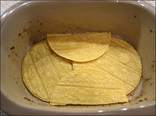 Back in the Deep Covered Baker, layer 3 corn tortillas on the bottom of the baker.